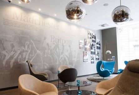 Welcome to Manchester, birthplace of music! Manchester made the soundtrack for any visit to the North-West: Oasis, The Smiths, Stone Roses and Take That grew to fame here. The Motel One Manchester-Piccadilly is adorned with wallpaper featuring famous local bands. In the bar area, club chairs by Varier and a seating cluster by Living Divani create a relaxed backstage ambiance, decorated appropriately with vinyl records and electric guitars. The symbol of the city, the hard-working bee, is also represented in the hotel, with a colourful photo collage dedicated to this emblem, golden hanging lamps by Produzione Privata in a shape reminiscent of a bee, and honey-yellow cushions on our Signet seating benches.